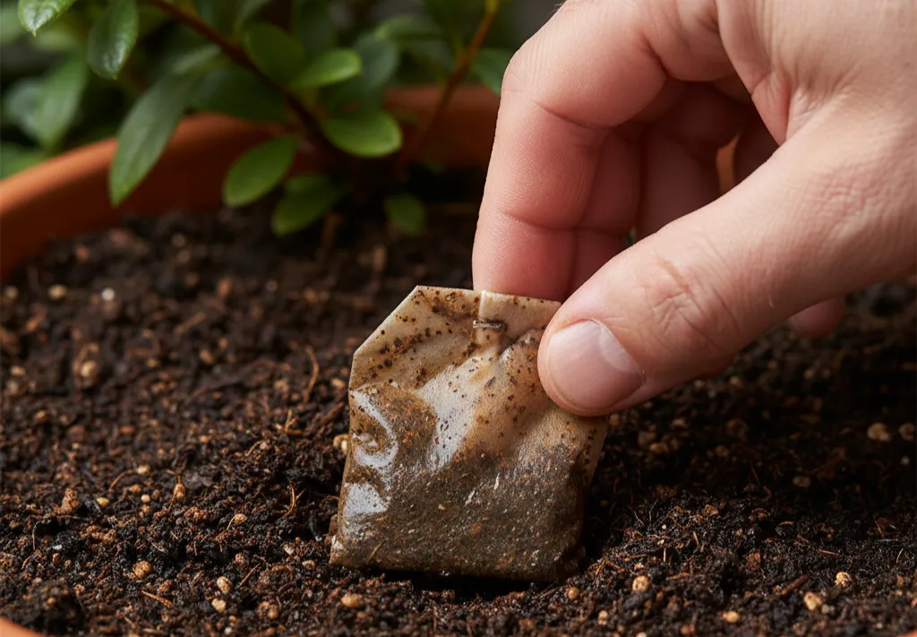 چای کیسه ای در گلدان ممکن است خاک را با نیتروژن، پتاسیم و فسفر ملایم تغذیه کند. برگهای چای تجزیهشده، مواد آلی را به خاک اضافه میکنند و ممکن است ساختار آن را متخلخلتر کنند. این روش، بهویژه برای گلدانهای کوچک، ممکن است مؤثر باشد.