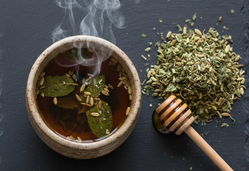 مصرف یک فنجان دمنوش نعناع گرم (۱–۲ قاشق برگ خشک در آب جوش) بعد از غذا یا هنگام دلپیچه میتواند حس راحتی ایجاد کند. اما در افراد با رفلاکس شدید یا فتق هیاتال ممکن است علائم را بدتر کند.